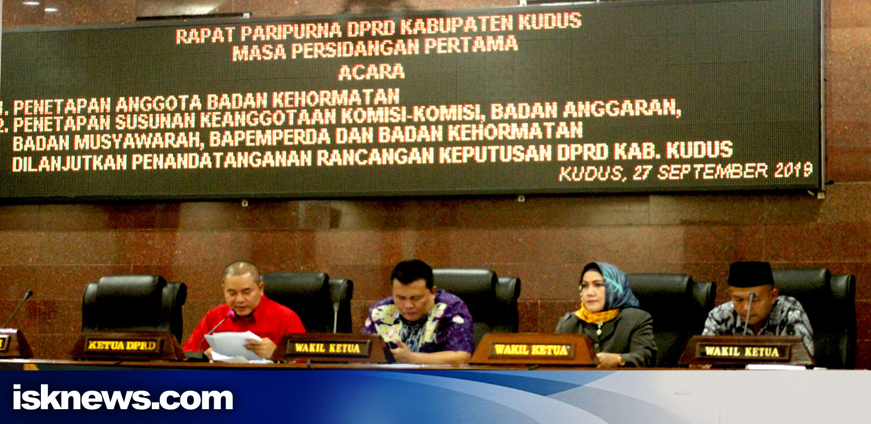 Kudus, isknews.com – Seluruh perasonalia Alat Kelengkapan Dewan (AKD) Dewan Perwakilan Rakyat Daerah (DPRD) Kabupaten Kudus akhirnya sore tadi berhasil ditetapkan. Penetapan tersebut dilakukan pada Sidang Paripurna DPRD masa persidangan pertama dengan agenda Penetapan Badan Kehormatan dan Penetapan susunan anggota komisi-komisi, Badan Anggaran, Badan Musyawarah dan Bapem Perda, Jumat (27/09/2019).