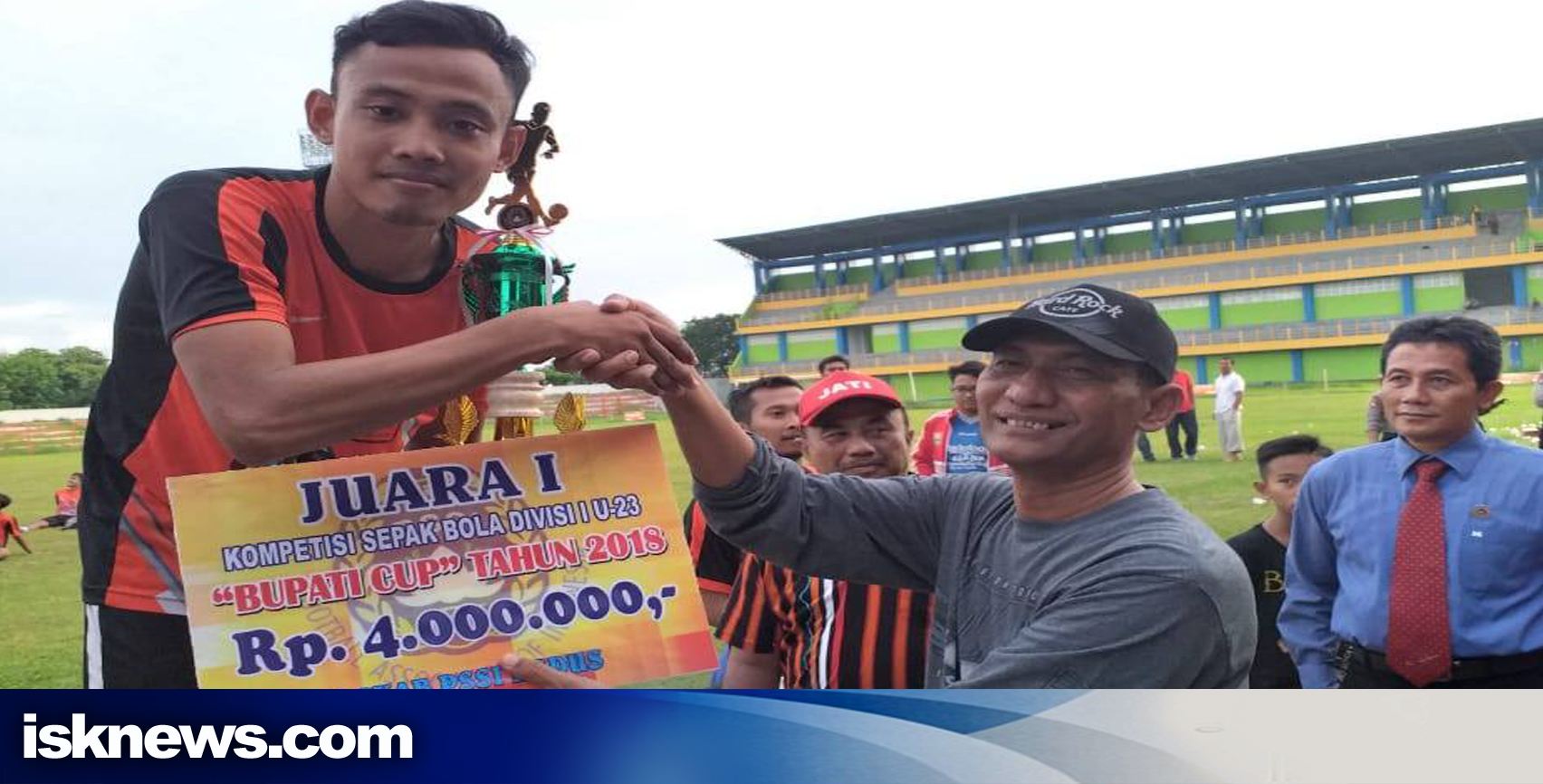 Bupati Kudus M Tamzil memberikan hadiah pada Bintar Raya yang berhasil menjadi juara Divisi I Kudus musim 2018. (Mukhlisin/ISKNEWS.COM)