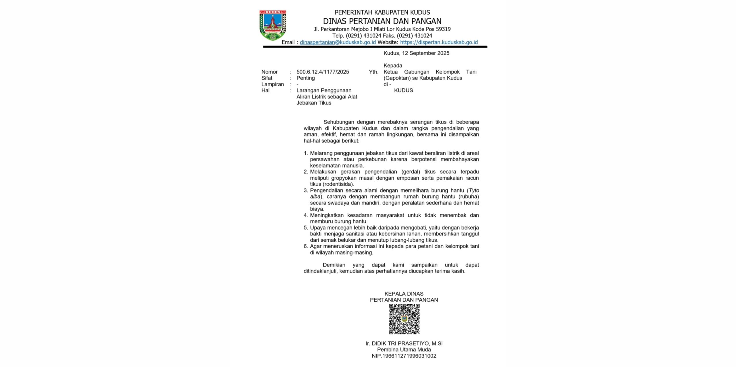 Kepala Dinas Pertanian dan Pangan Kudus, Ir. Didik Tri Prasetiyo, M.Si, menegaskan bahwa praktik pemasangan kawat beraliran listrik di area persawahan maupun perkebunan berbahaya dan tidak bisa lagi ditoleransi.