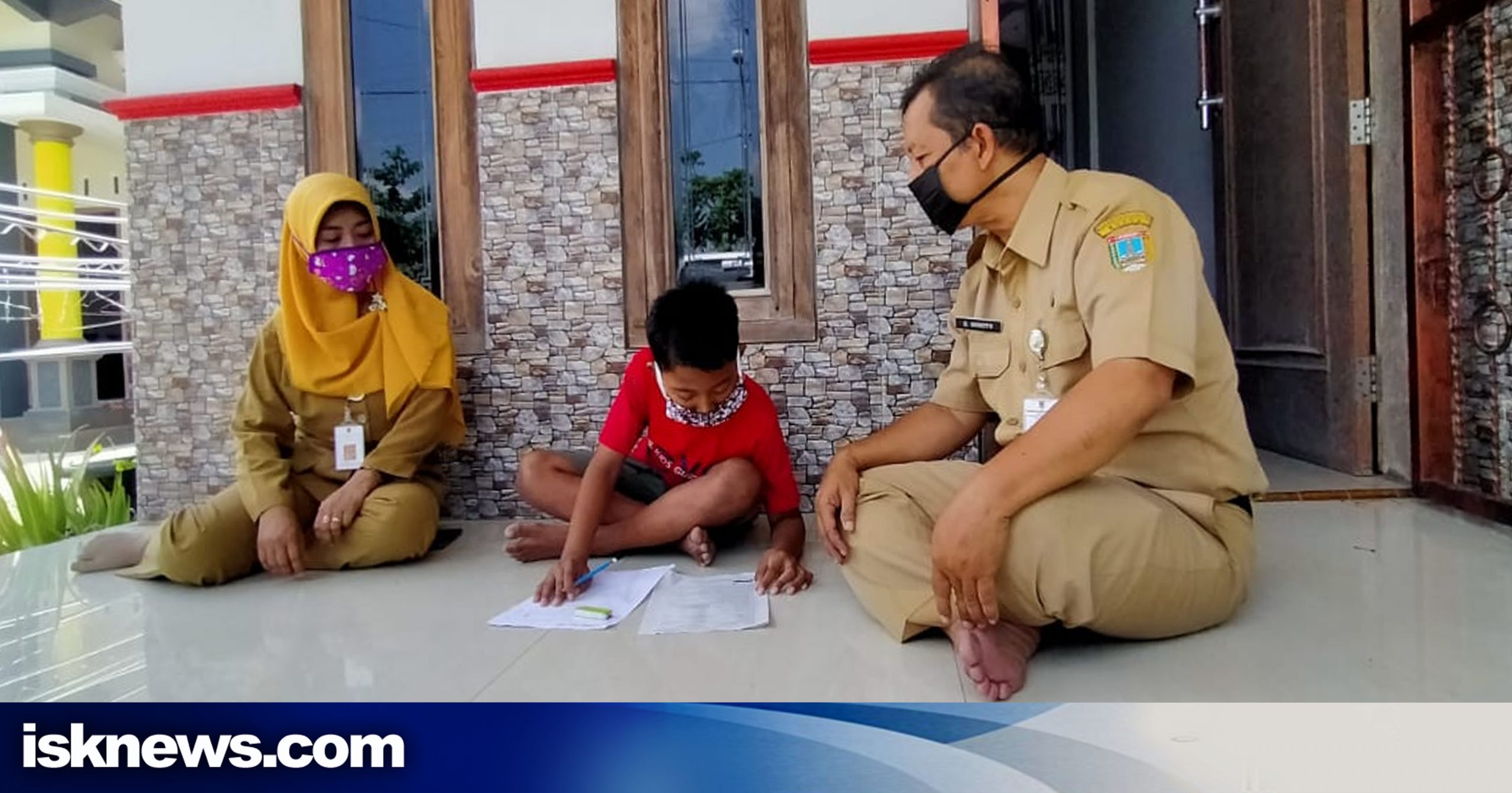 Wildan siswa SD Berugenjang saat dikunjungi kepala sekolah dan gurunya sedang mengerjakan soal PTS Luring (Foto: YM)