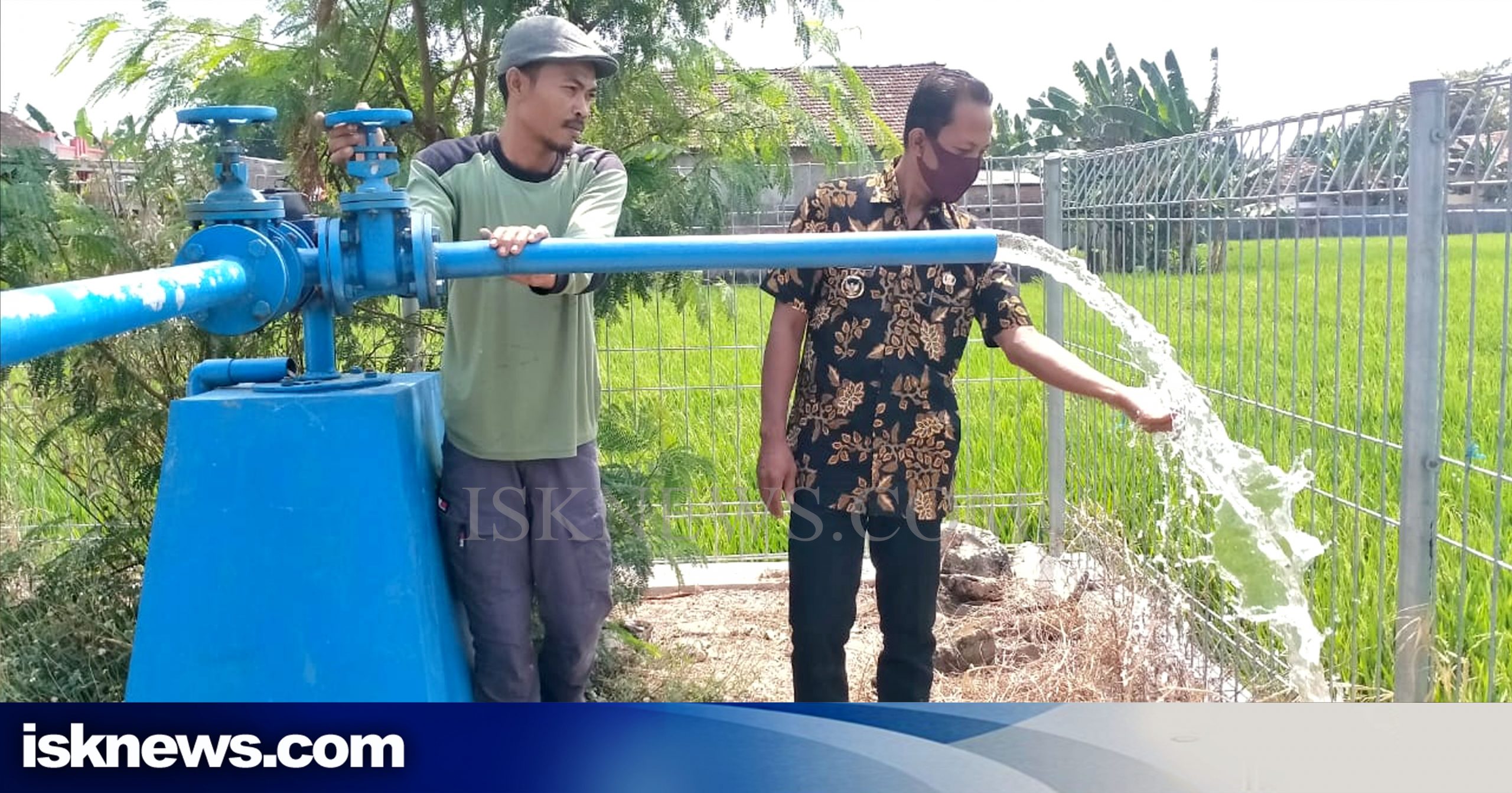 Kepala Desa (Kades) Banget, Slamet Widodo (Kanan) dan pengelola Pamsimas Tolikan saat menunjukkan besarnya debit air Pamsimas di wilayahnya (Foto: YM)