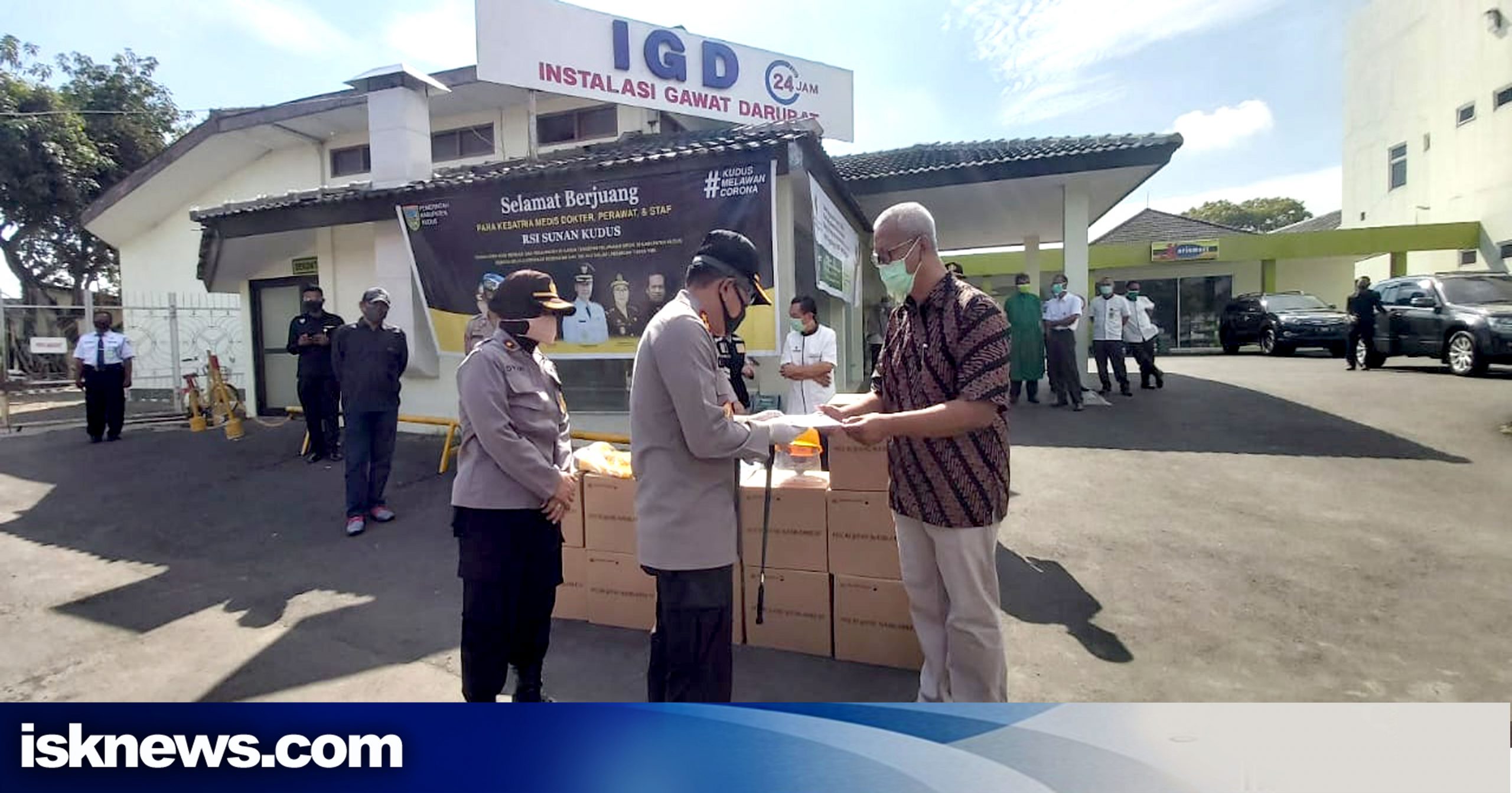 Bertempat di halaman RSI Sunan Kudus, Polres Kudus menyerahkan bantuan alat pelindung diri (APD) untuk tenaga kesehatan dirumah sakit lini ketiga penanganan covid-19 di Kudus tersebut.
