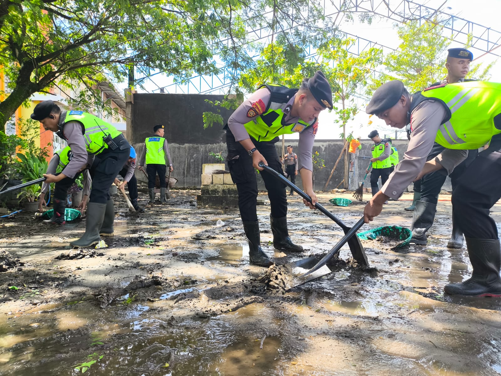 “Setelah banjir surut, masih banyak lumpur yang menempel di halaman dan ruang sekolah. Kondisi ini tentu rawan, terutama bagi anak-anak. Karena itu kami lakukan kerja bakti agar sekolah kembali aman digunakan,” ujar AKBP Heru di sela kegiatan.