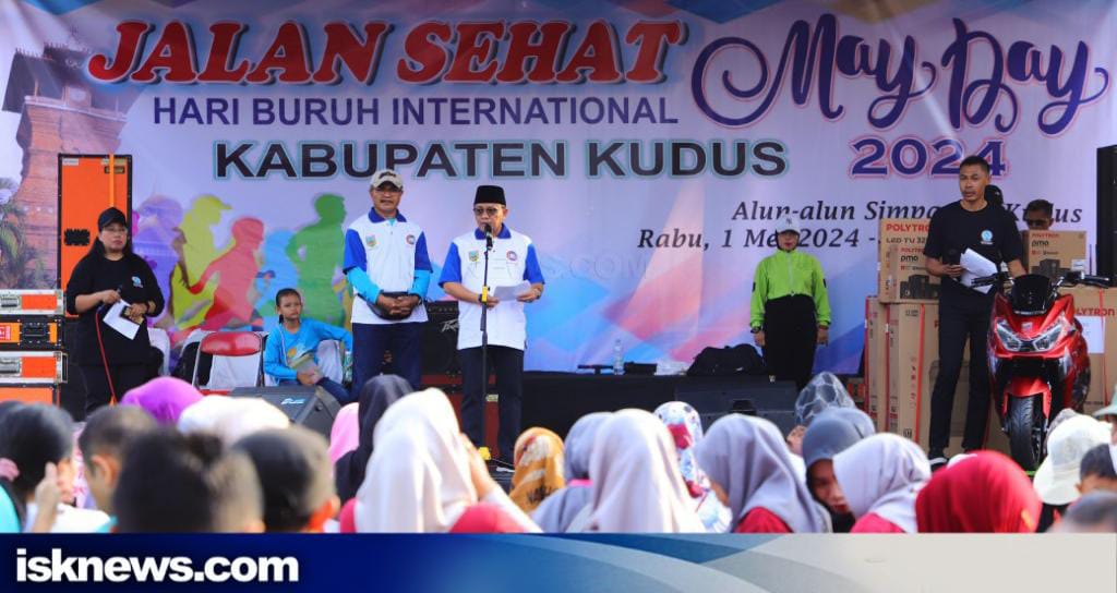 Kudus, isknews.com – Hari Buruh Internasional (May Day) dirayakan oleh ribuan pekerja di Kudus. Pada Rabu (01/05/2024), pekerja dari berbagai perusahan berdatangan ke Alun-Alun Simpang Tujuh Kudus untuk meramaikan agenda Jalan Santai dalam rangka Hari Buruh Internasional.