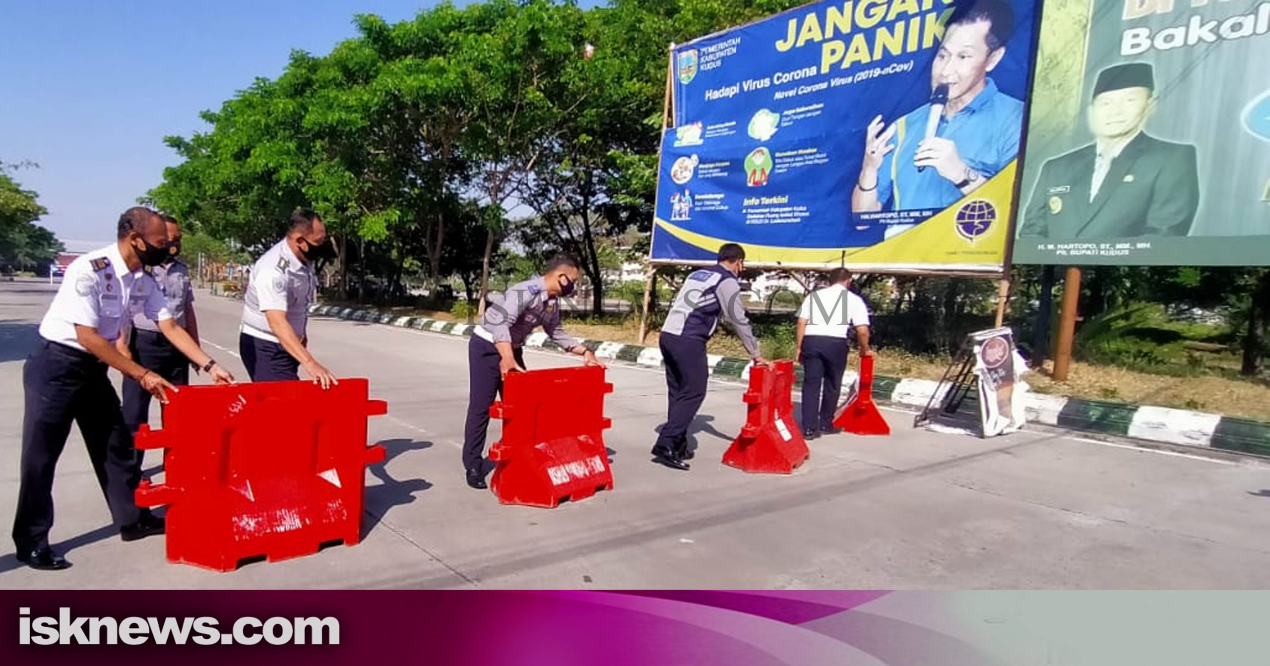 Petugas dari Dinas Perhubungan Kabupaten Kudus saat membuka barikade water barrier di terminal Bakalan Krapyak sebagai penanda telah dibuka kembali (Foto: YM)